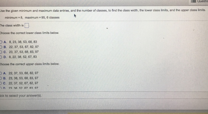 Class boundaries are the least and greatest numbers for a softball game, class a # seats cost $15, class b cost $12. Statistics q&a library identify the lower class limits, upper class limits, class width, class midpoints, and class boundaries for the given frequency distribution. Asked about the way statisticians identify upper and lower limits of class intervals found in a variable's frequency distribution. Class boundaries are used for exclusive class intervals while class limits are used for inclusive class intervals. Subtract a 5 to the decimal place to the right of the last number appearing in the lowest value specified by the number in the class interval.